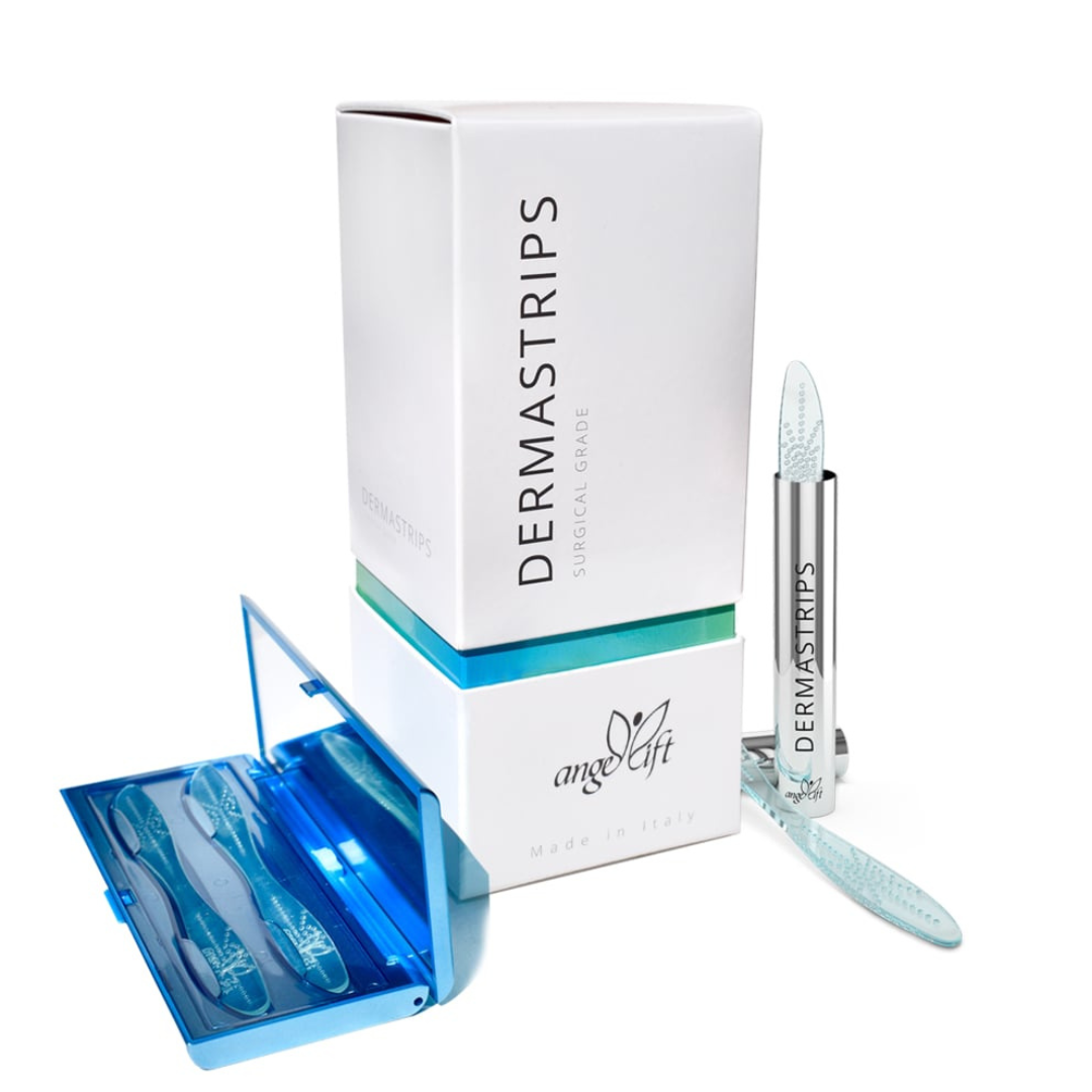 Each patented AngelLift Dermastrip is manufactured from a special surgical grade hydrogel, which is soft, flexible and hypoallergenic. Your Dermastrip purchase includes two, reversible Dermastrips, and a specially designed case for hygienic storage.